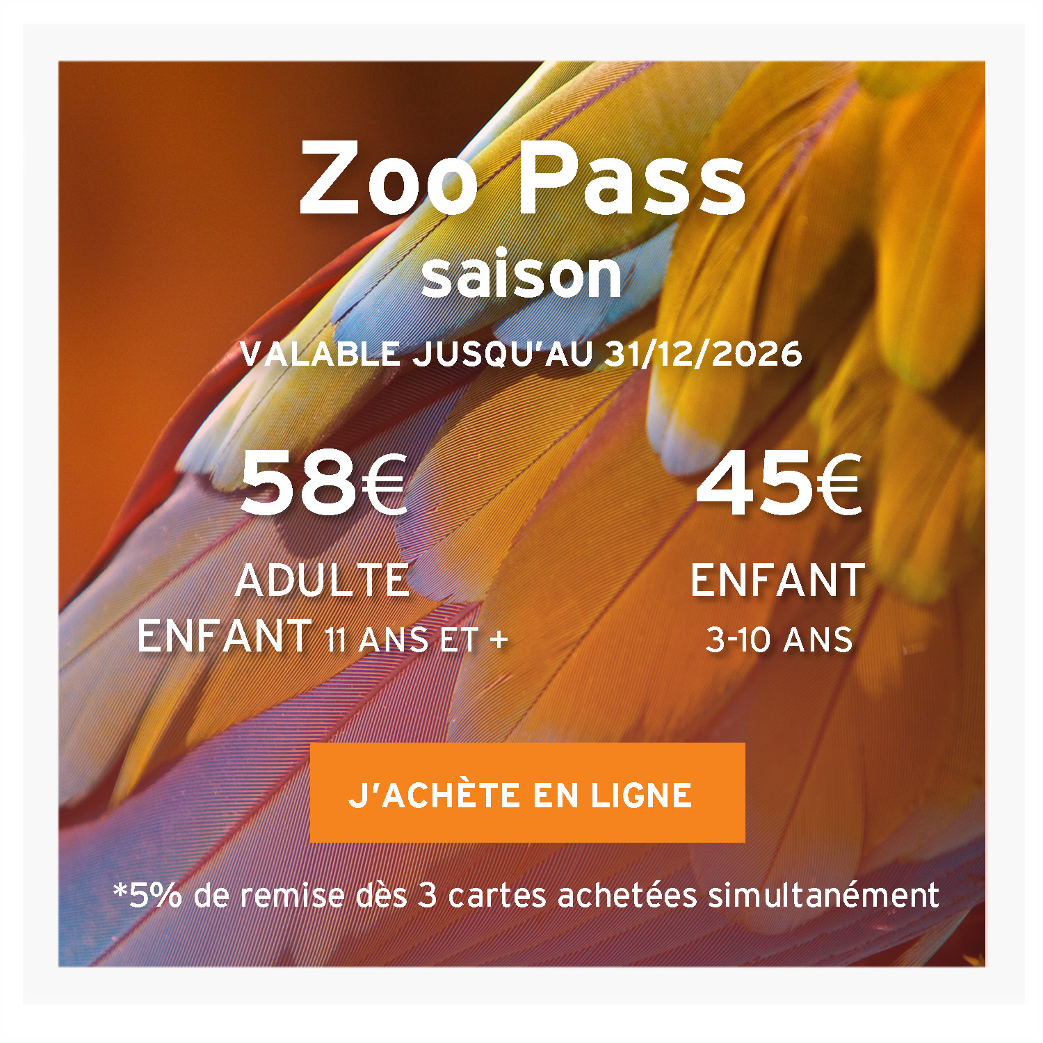 Grâce à une carte d’abonnement amortie dès la 2ème visite, profitez d’un accès illimité au Bioparc durant toute la saison en cours. Et bénéficiez d’une remise de 5% dès 3 cartes achetées simultanément !
